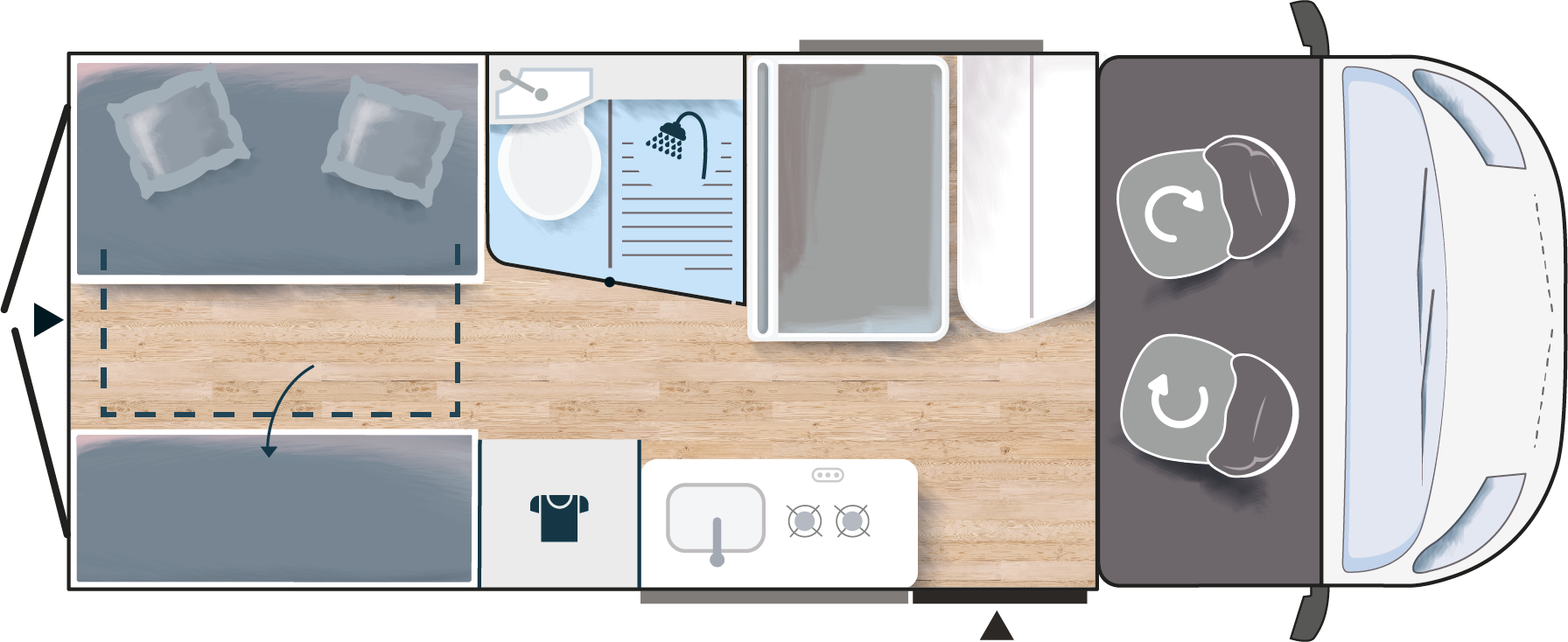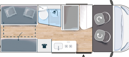 C'est le plan légendaire que les amateurs plébiscitent : Compact (5,99m), le V114 se faufile partout, en ville comme à la campagne ! Salon convivial, salle de bains & cuisine fonctionelles, le V114 vous séduira aussi par son lit arrière 2 places qui se relève pour dégager de l'espace.