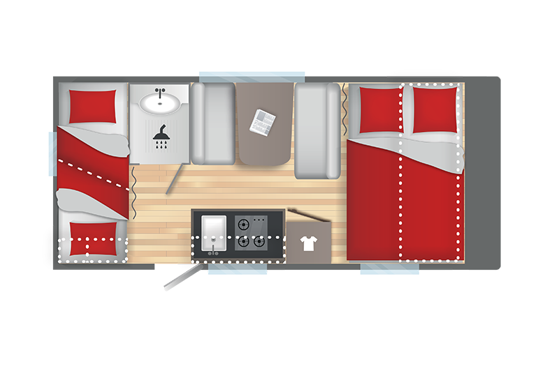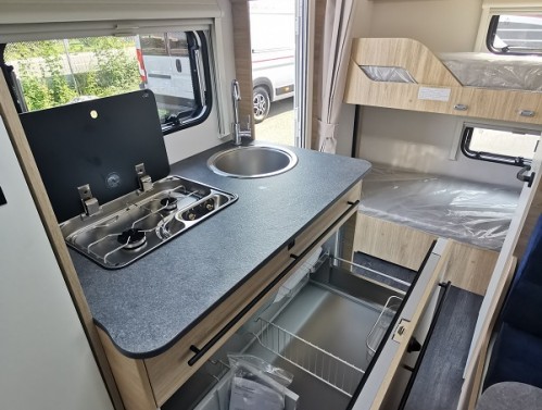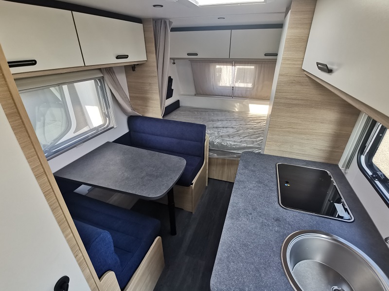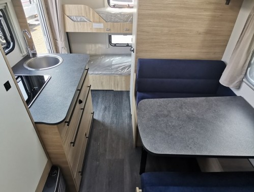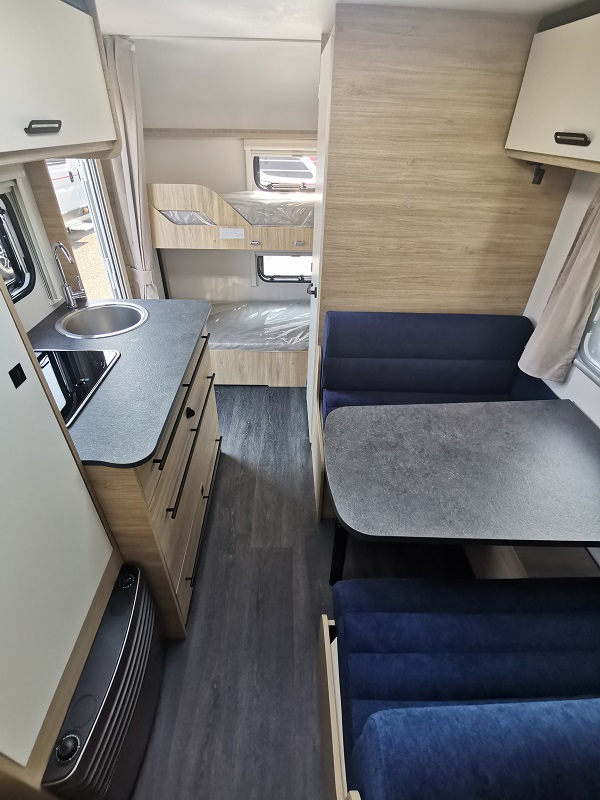 Avec ses deux lits superposés, son grand lit fixe à l’avant et une dinette convertible, la 470PE offre une vraie solution familiale. Bien agencée, bien équipée, elle permet de voyager à plusieurs tout en gardant un espace de vie agréable et pratique au quotidien.