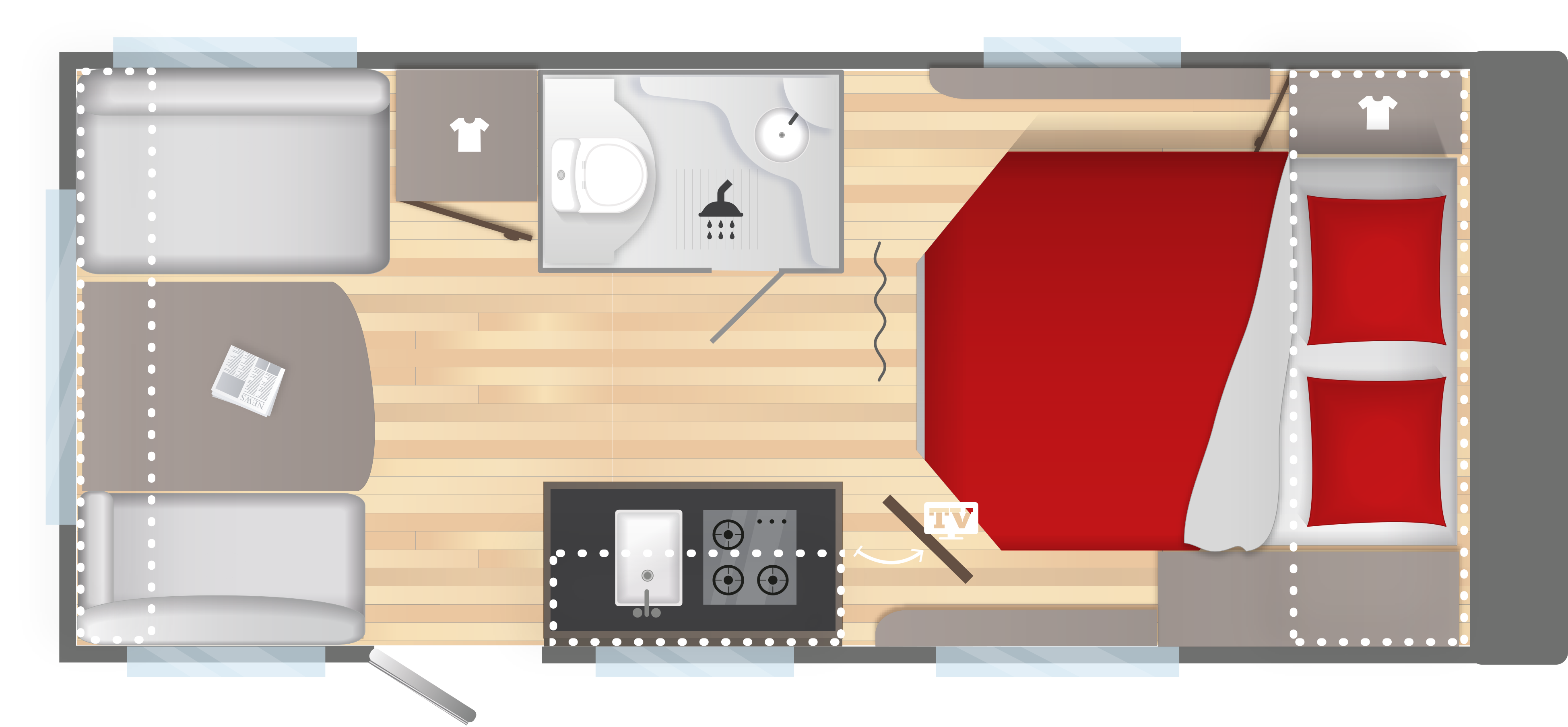 Dotée d’un lit central accessible de chaque côté et d’un salon arrière modulable avec table indépendante, la 480CP mise sur un agencement qui optimise à la fois le confort nocturne et la convivialité en journée. Fonctionnelle, bien équipée et facile à vivre, elle s’adapte à tous les styles de voyage.