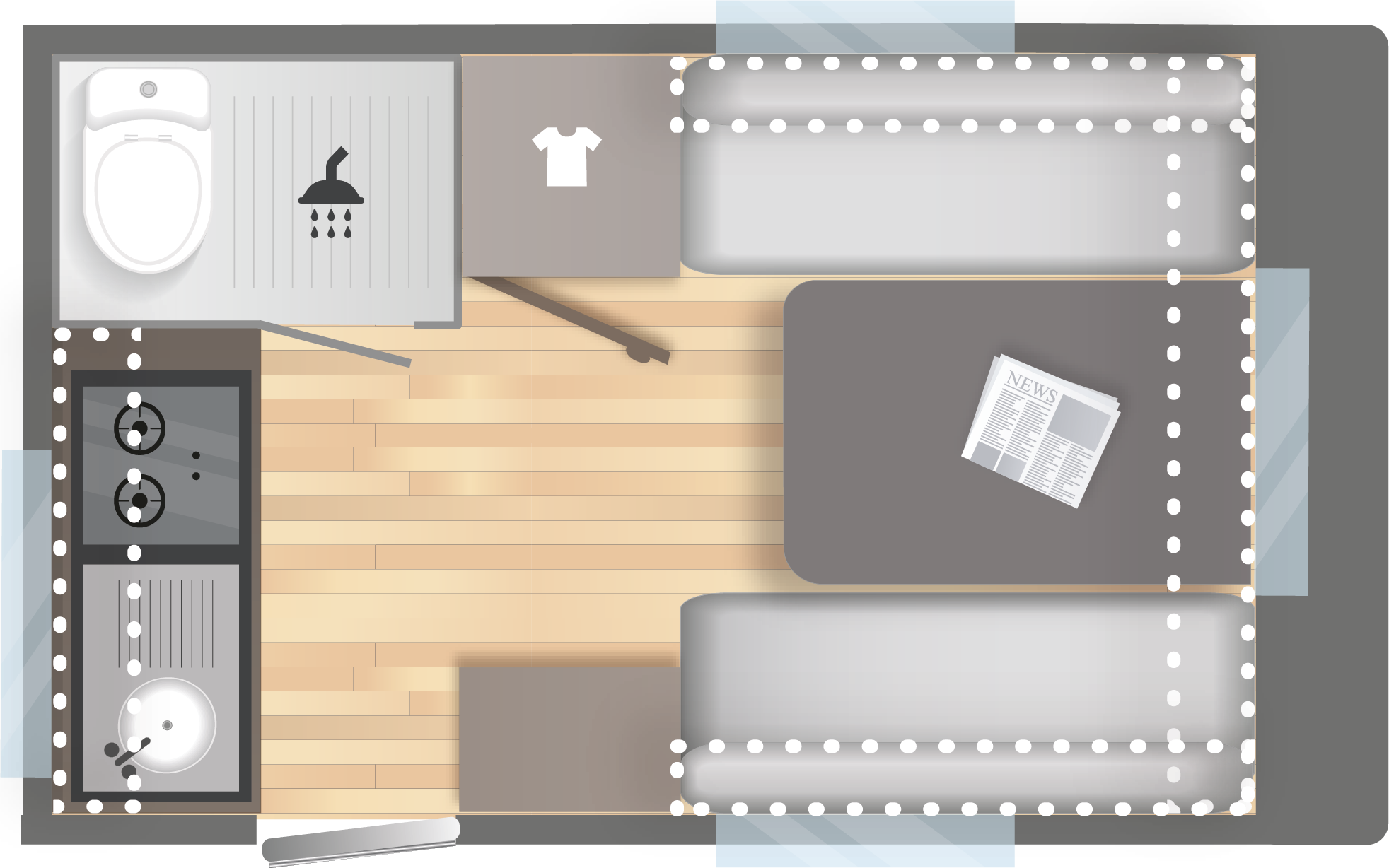 Compacte et légère, la MINI FREESTYLE 290 est équipée d’un cabinet de toilette avec wc et lavabo. Sa cuisine est positionnée à l’arrière et son salon se transforme facilement en véritable lit confortable 2 places.